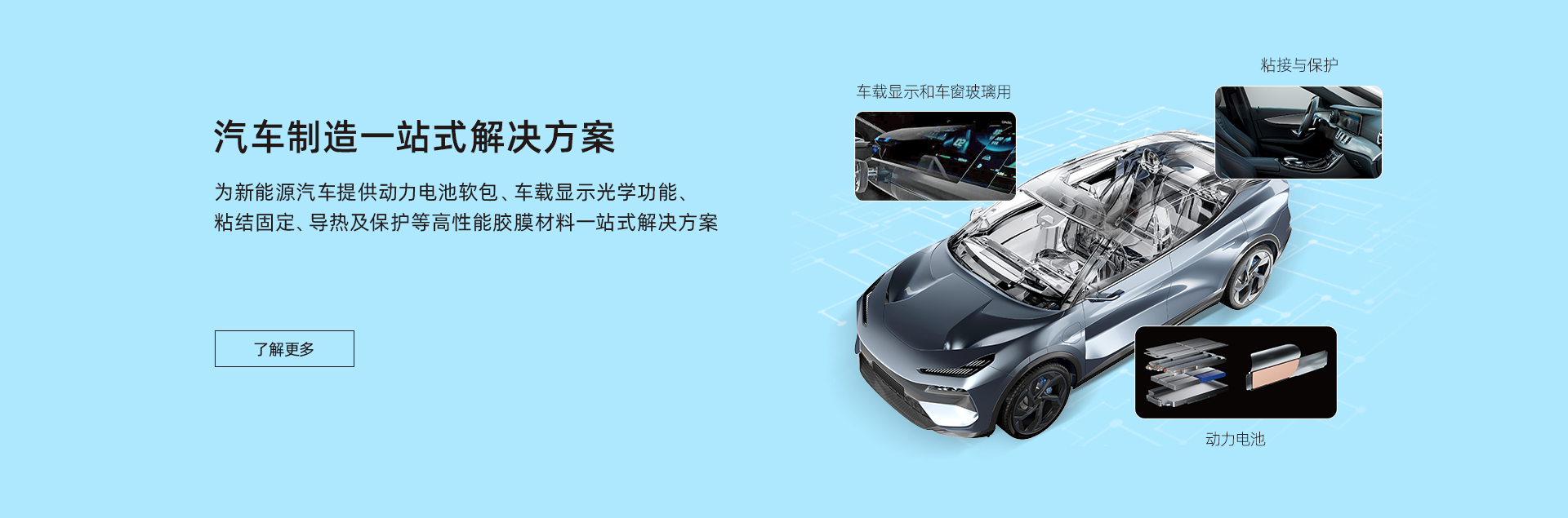 致力于為汽車制造、消費電子、智慧顯示端口等行業(yè)客戶提供包括新能源材料、電子功能材料、光電顯示材料、有機硅材料在內的產品研發(fā)、生產、銷售于一體化服務,建立了專業(yè)的市場營銷與技術服務團隊,為客戶提供高性能膠膜材料一站式解決方案。